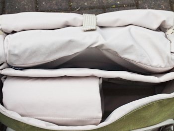 Opening the top flap reveals the usual NGEE waterproof zip flap that seals the main opening of the bag. This flap is unzipped, rolled up and fastened with a velcro strap to allow access to the main compartment.