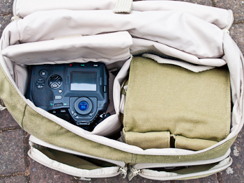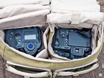 With the lid open on the small EE bag you can see my E-30 on the right. Both cameras (with no battery holders) fit into the bag very easily and are easy to access. Wearing the bag on the shoulder, it is comfortable with a padded strap and the canvas material of the strap gives a nice ‘give’ to the bag making it very nice to wear.