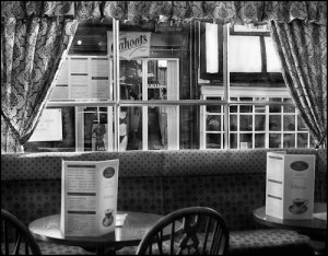 Taken with an Olympus E-410. I was struck whilst sitting in a small café in Lincoln with the olde-world charm of it and the view outside. The two menus on the tables anchor the shot and the sides and top are framed by the curtains. The eye then drifts out of the window to the world outside. I love the detail that the low AA filter of the E-410 has picked up; the third menu stuck on the window, the clothing in the window of the shop opposite and the two people in the coffee shop across the road.
