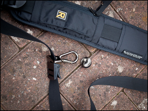 The strap hangs diagonally across the body and a free-sliding carabiner clamps over a metal ring which screws into the tripod socket of the camera.