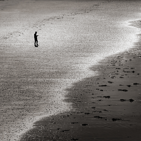 The first image was taken whilst I was standing on Weston’s pier. I notice the man walking on the sand just in front of the lapping waves. He stood there smoking for a while, just watching the waves lap up the shore. I decided to meter on the wet sand on which he stood to render him in silhouette.