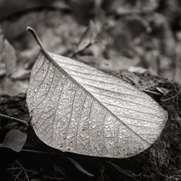 The first image is of a leaf that I noticed on the ground. Morning dew had formed over it and its light yellow colour stood out against the vegetation on the floor. I deliberated whether to make this a colour or mono image and I decided on the latter. Taken with a short telephoto lens the zone of focus is quite narrow but it works.