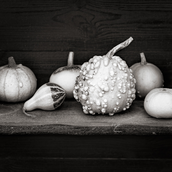 The third image is of some vegetables on a shelf. We know that the warty pumpkin is an orange colour, but in this image that is not important. We are concentrating on its texture and making it stand out against the other vegetables. The others also need to be part of the composition and so received subtle toning. If this was a colour photograph, the focus would not have been so strong on the large, ugly pumpkin. It is easier for us take in a colour photograph with a sweep of the eyes, but a monochrome image needs more of an investment of time and interest.