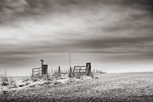 I like the apparent lonely, barren waste, broken fence and signpost in the first photograph. It gives a very strong impression of cold isolation. In reality, there was a wood and village behind me and to my right more fields and a manor house.