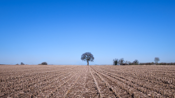 The second photograph was taken in a field that had just been harvested. I was drawn to the single large tree in the distance and the lines of crop stalks in the field. I moved around the field until I got the lines lining through to the tree and took the image.