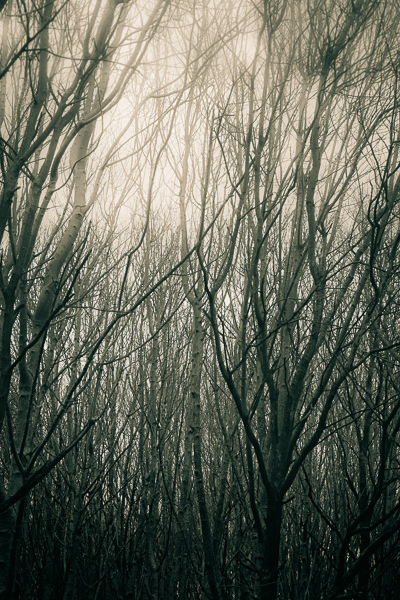The final image is a split-tinted photograph. Shot in woods near my home, there was a slight mist and the sun was trying to get through. I shot up into the light ensuring that the bottom third of the image was left darker and the thin branches of the trees were backlit by the weak sun. In Lightroom, during the processing, I gave the image a split tint with the light tones receiving a very weak yellow tint and the dark tones a “dirty” green tone. This gave me the slightly ominous air I wanted and together with selective sharpening in NIK, helped enhance the depth of the photograph. The eye is drawn into the image near the bottom of the frame then the light area at the top pulls the viewer up to the branches near the edge. The whole image has a mysterious air to it and to me, those branches at the top of the frame can almost be seen gently moving.