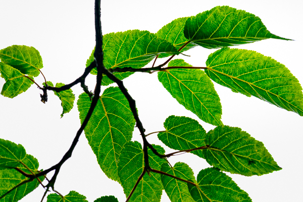 This next shot is taken further away from the tree to show the leaves attached to the branch. Once again the contre-jour allows the construction of the leaf to be easily seen and the greens enhanced.