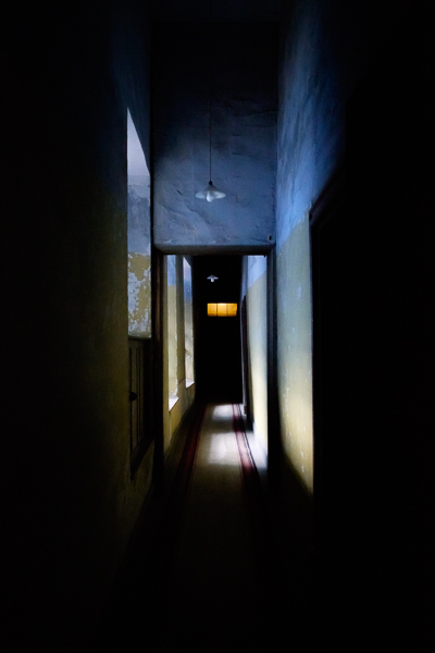I have taken many shots from this viewpoint down an old corridor in the house. The paint peeling from the walls, the light coming in from the windows and the deep shadows all lend an eerie feel to the view. The title comes from the fanciful thought I had that to avoid whatever is laying in wait within the gloom, one would have to go down the corridor avoiding the shadows.