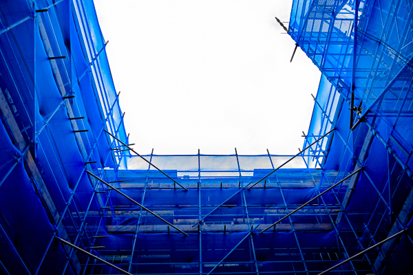 This photograph was taken in the courtyard in the centre of Calke Abbey, There were repairs to the walls being undertaken, and to protect the visitors, the scaffolding used by the workers was surrounded by plastic netting. Rather than using the horrible orange stuff, they had opted for a more pleasant, photogenic blue. I took the shot shooting up at the gap of sky between the four sides of the house and the light coming through the netting gave it a luminescent feel.