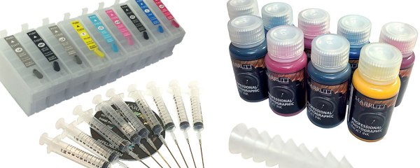 After looking around I decided to purchase the Refillable Cartridge System from Marrutt. I purchased the set specifically for the P600 and it arrived quickly and very well packaged. In the set (which is supplied with a plastic box to keep all the components in) you get the nine replacement refillable cartridges, the replacement ink (I ordered the 125ml bottles), 9 syringes to fill the cartridges, latex gloves and instructions. I had a couple of questions after it arrived and Marrutt were really helpful, full marks for their customer service.
