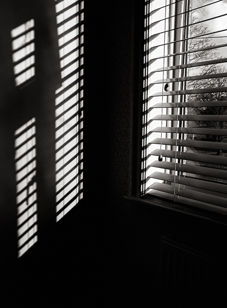 The image is a late afternoon capture of the sunlight through our bedroom blinds.