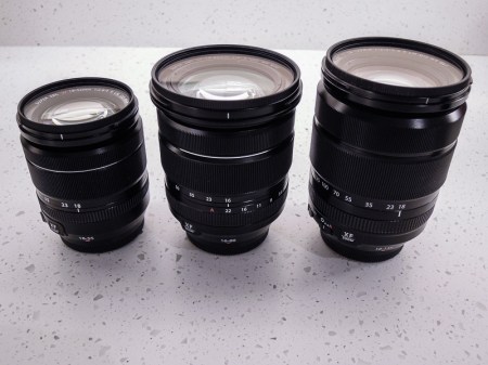 The XF16-80mm is larger than the XF18-55mm but slightly smaller than the XF18-135mm. The front element however is larger than both other zooms with a 72mm diameter.